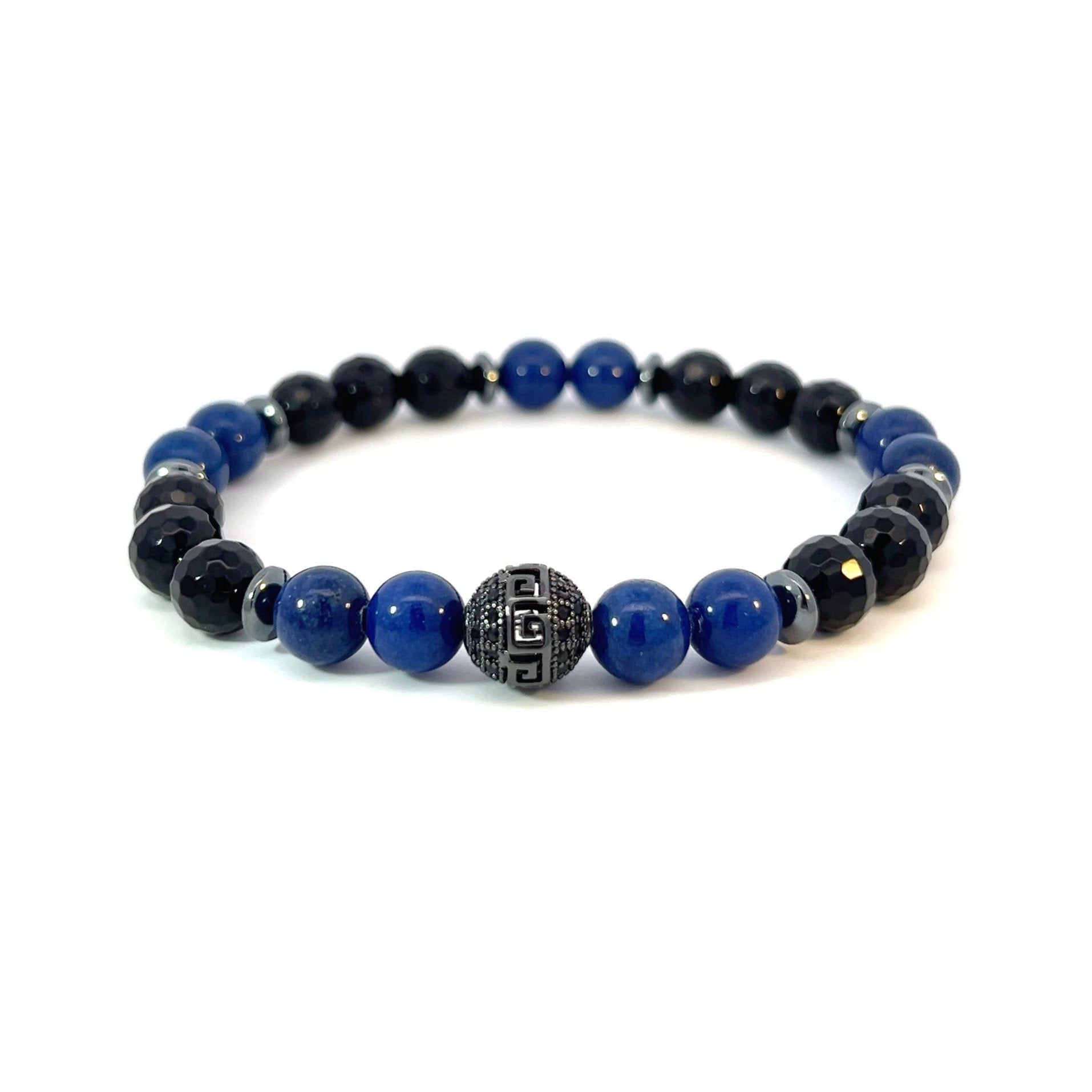 This striking bead bracelet is crafted with a harmonious blend of Blue Mountain Jade and Faceted Onyx stones, providing a bold and sophisticated look. The hematite stone spacers add a sleek, polished touch, while the black metal pavé centerpiece serves as the bracelet’s focal point, elevating its modern appeal. -