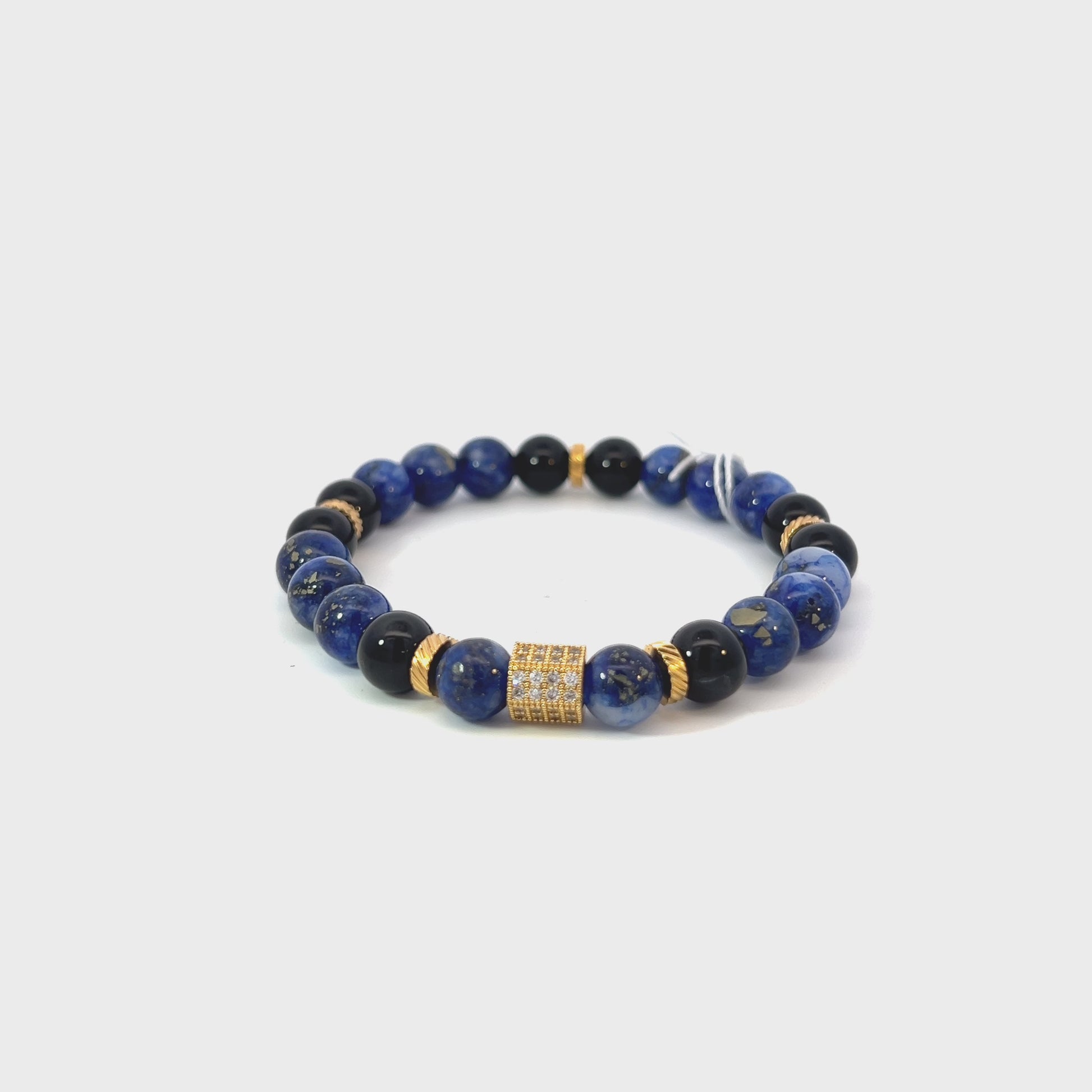 Elevate your look with this luxurious 8mm Lapis Lazuli and Onyx Bead Bracelet, accented by gold-plated spacers and a dazzling gold-plated pavé centerpiece. The deep blue Lapis Lazuli beads evoke a sense of wisdom and royalty, while the sleek black onyx beads bring grounding and protection. The gold-plated spacers add a touch of sophistication, and the pavé centerpiece shines with elegance, making this bracelet a true statement of luxury and style.