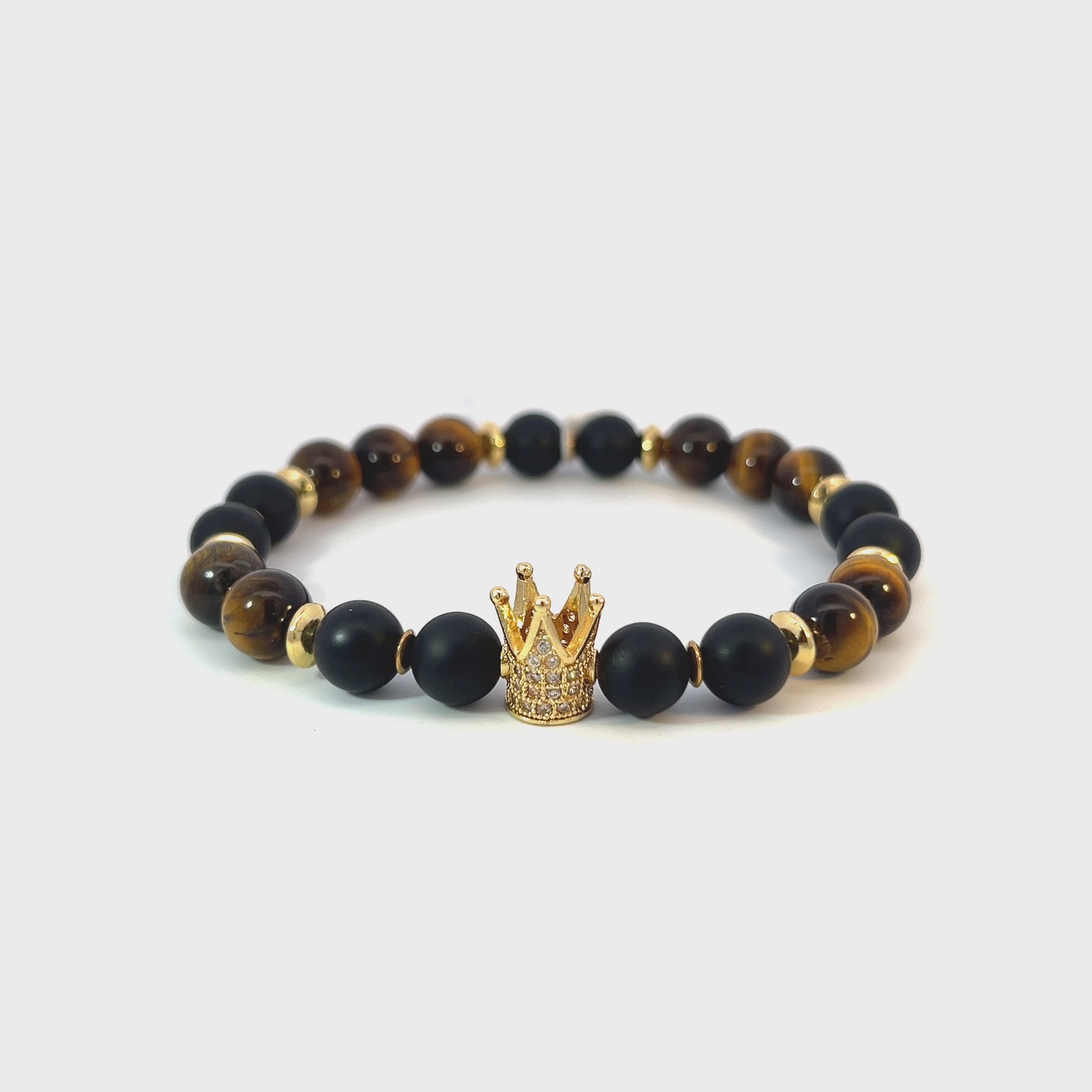 This elegant semi-precious stone bead bracelet is made with 8mm Matte Onyx and Tiger Eye stones, beautifully accented with gold-plated hematite and gold-plated metal spacers. The centerpiece is a striking gold-plated pavé crown, adding a regal touch and elevating the bracelet's overall luxurious feel. -