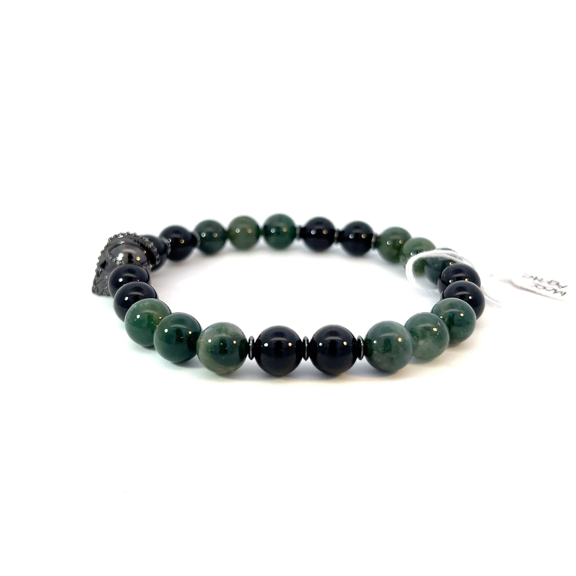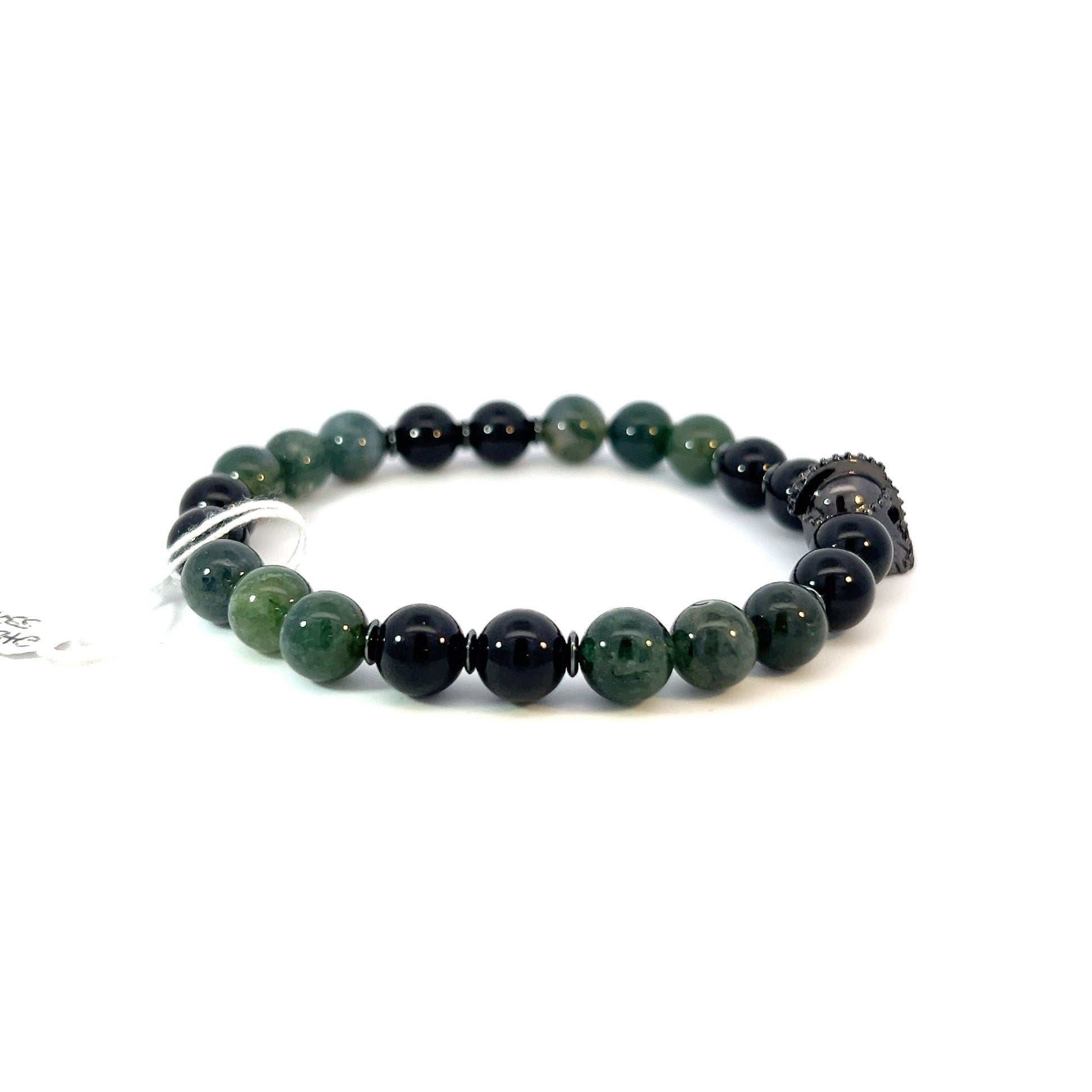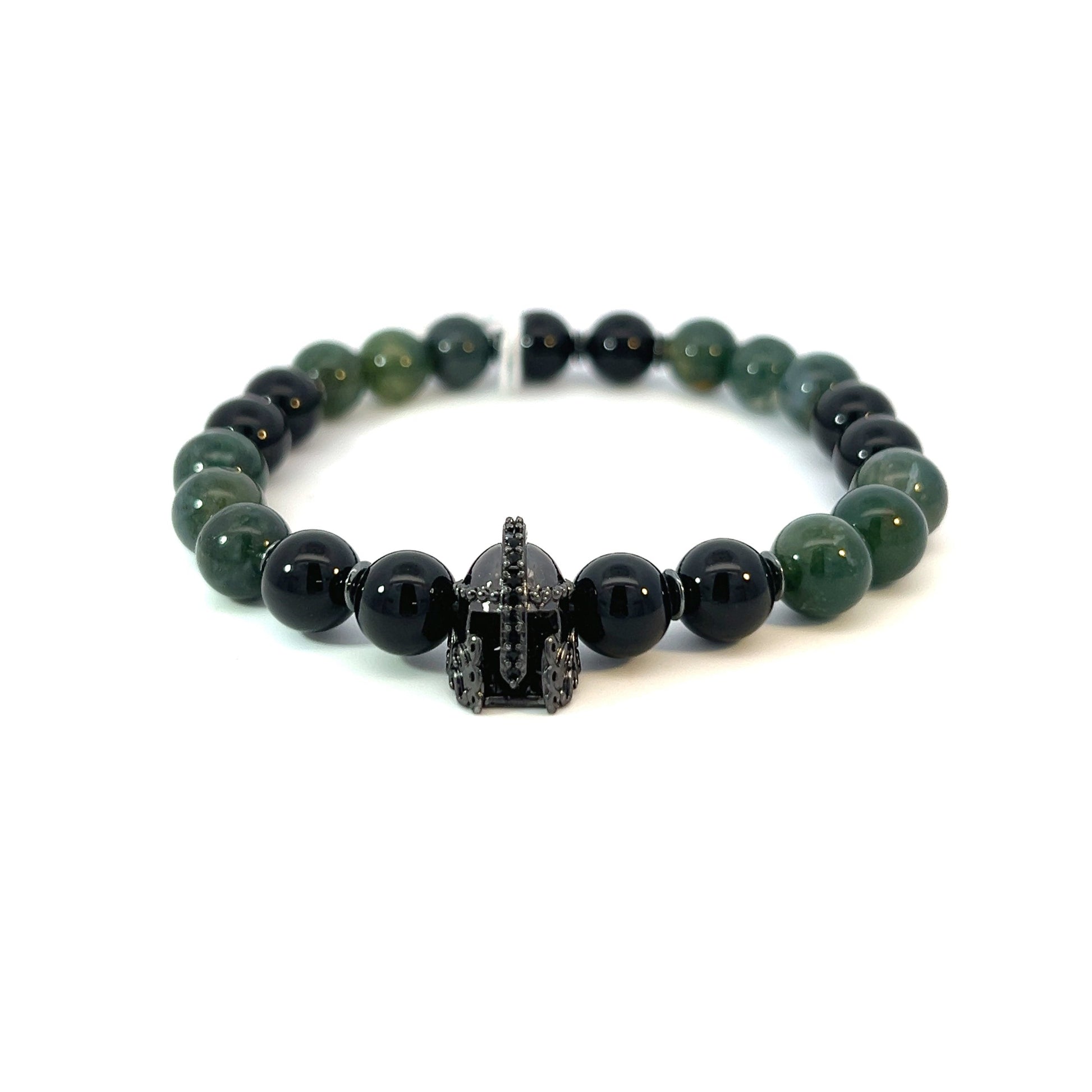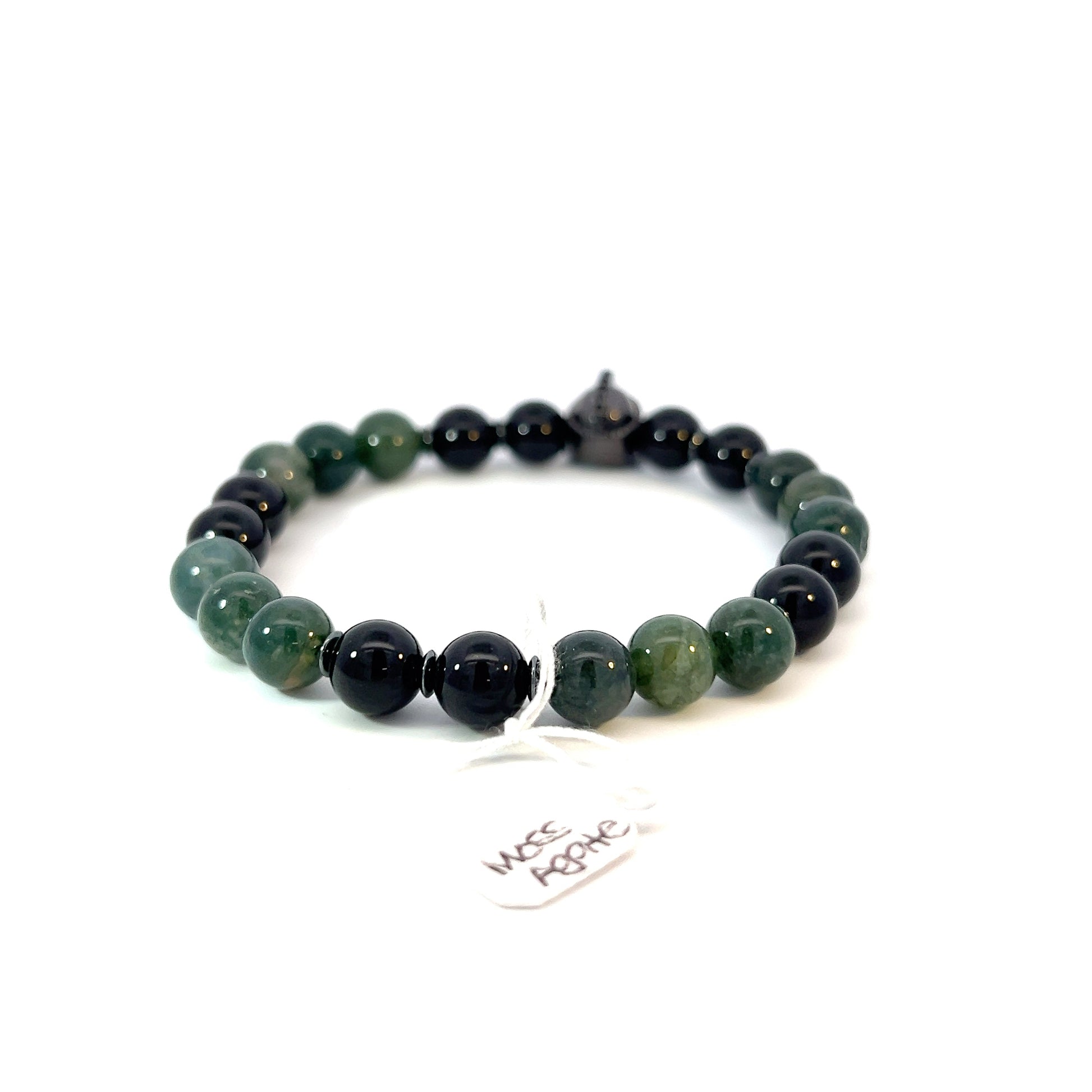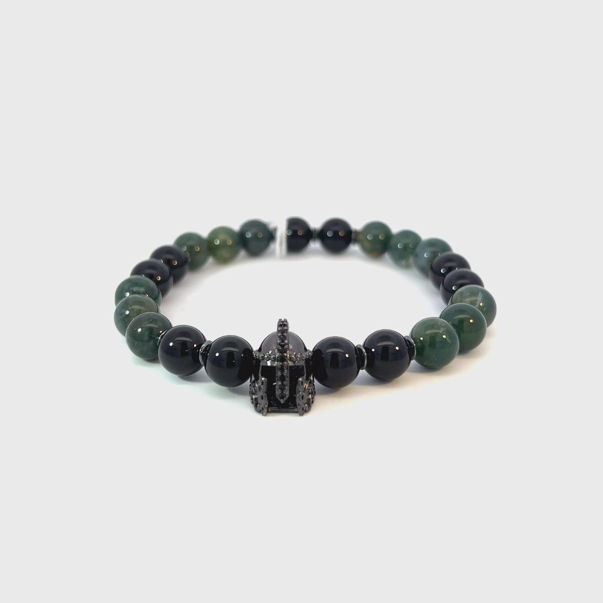 Elevate your style with our stunning Bead Bracelet featuring 8mm Moss Agate and Onyx stones, accented by Hematite stone spacers and a striking Black Metal Gladiator Centerpiece. This unique bracelet is not only a fashion statement but also a blend of natural beauty and powerful properties.