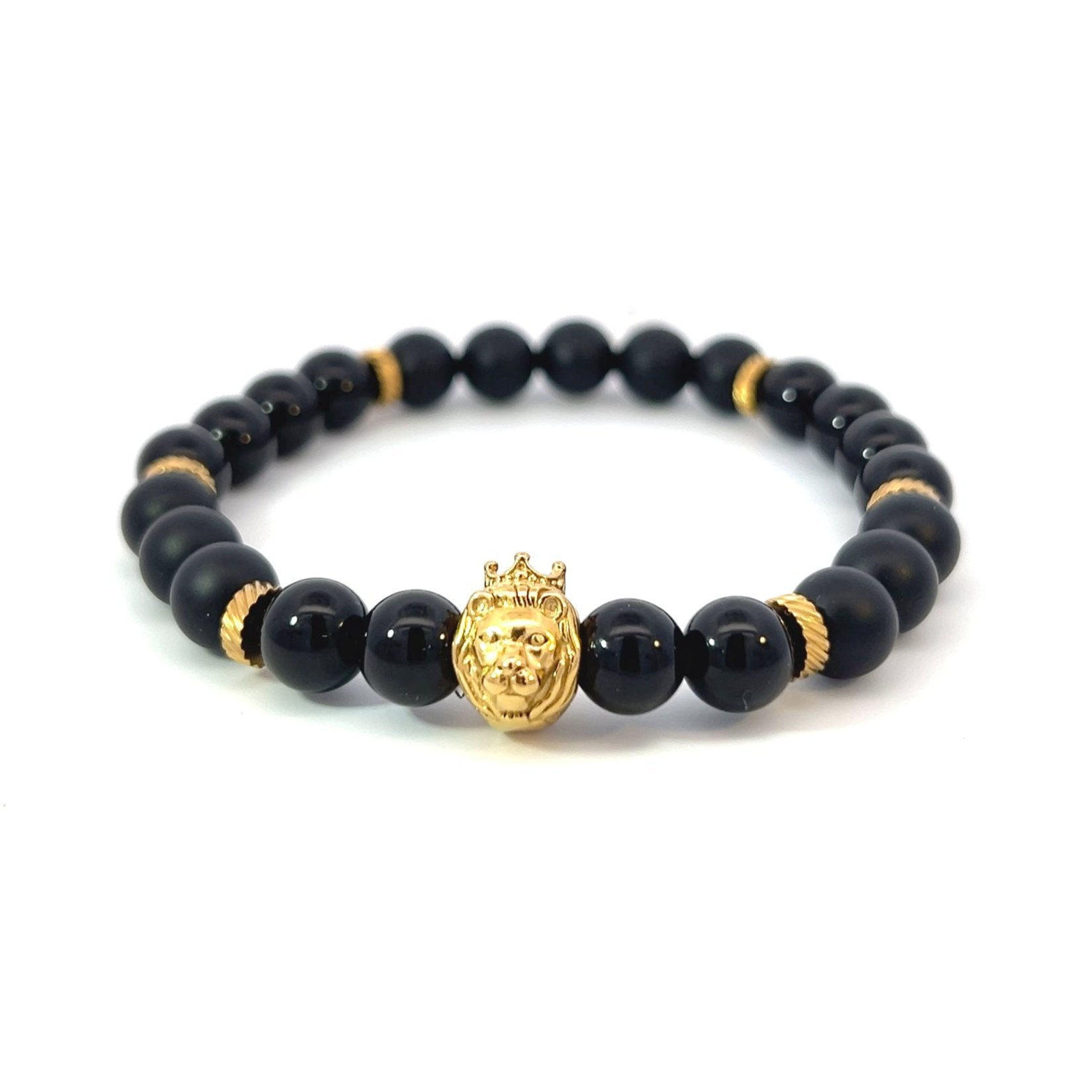 Command attention with this bold and luxurious 8mm Onyx Bead Bracelet, featuring sleek gold-plated spacers and an impressive gold-plated lion centerpiece with a crown. The black onyx beads represent strength and protection, while the gleaming gold accents bring a sense of regal elegance. The lion with a crown at the center of the bracelet symbolizes power, courage, and leadership, making it a perfect statement piece for those who exude confidence and authority.