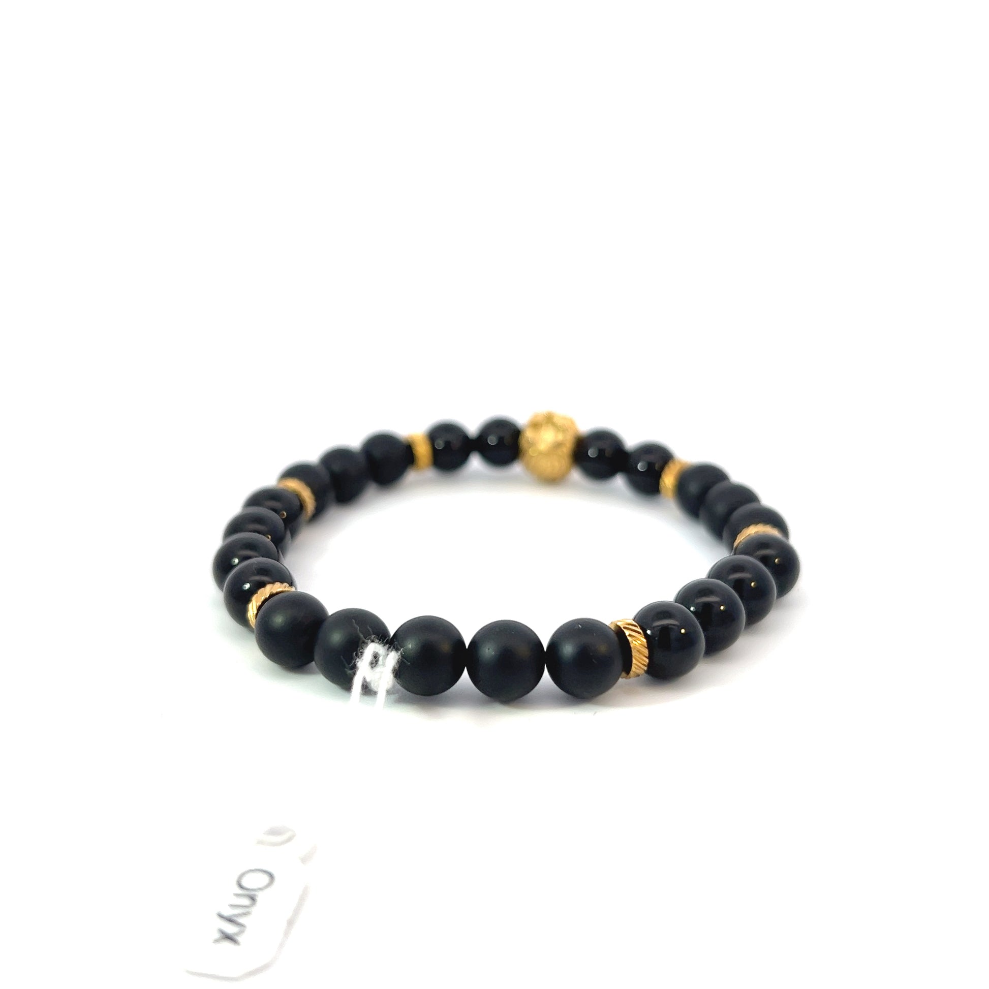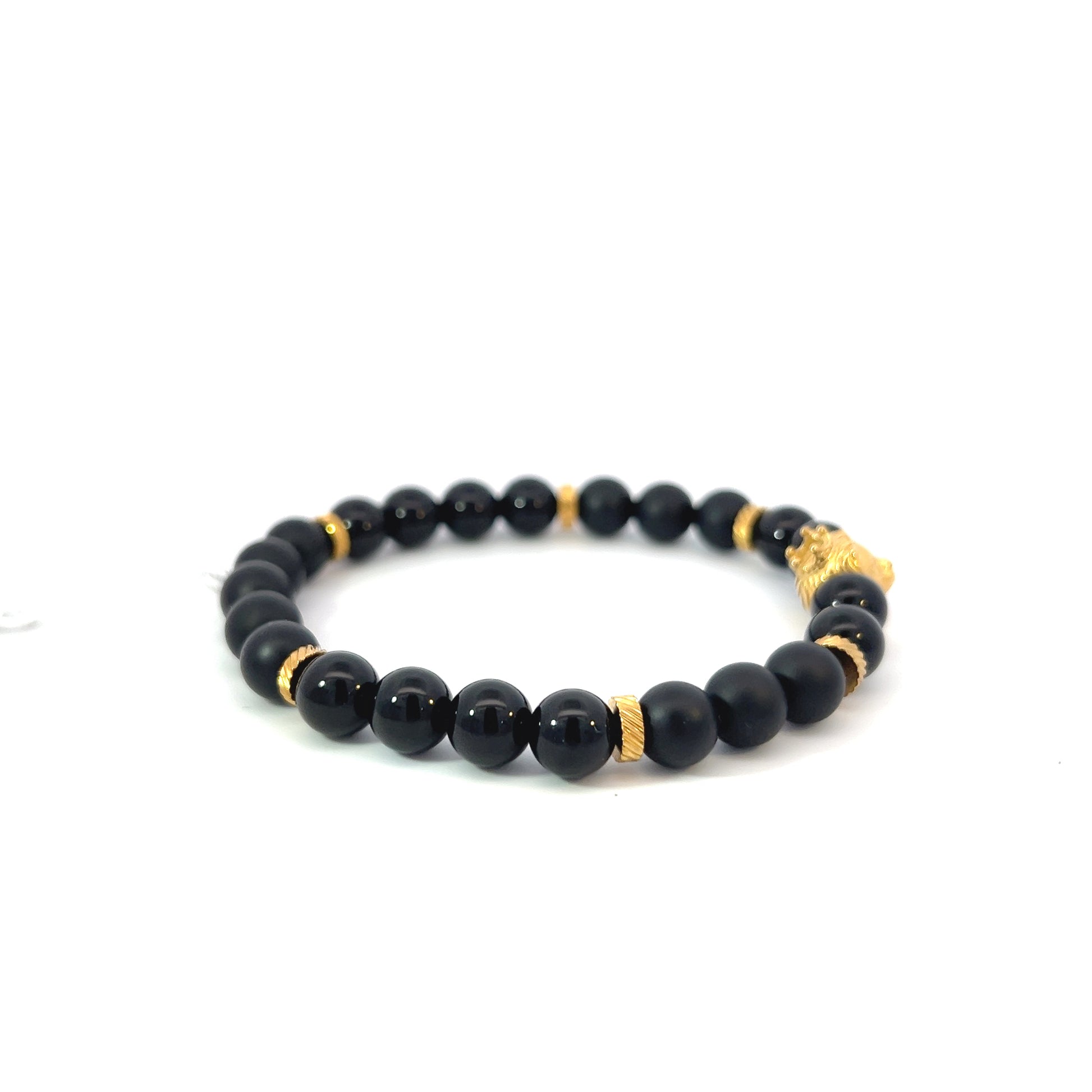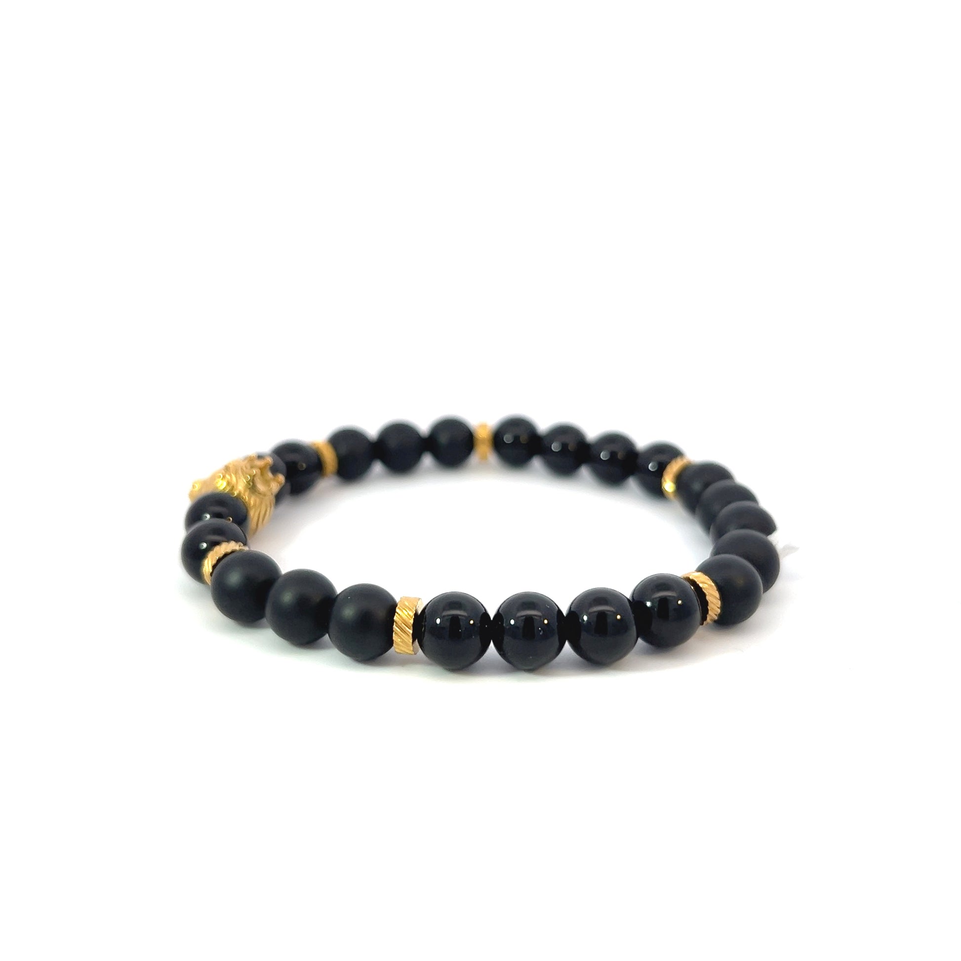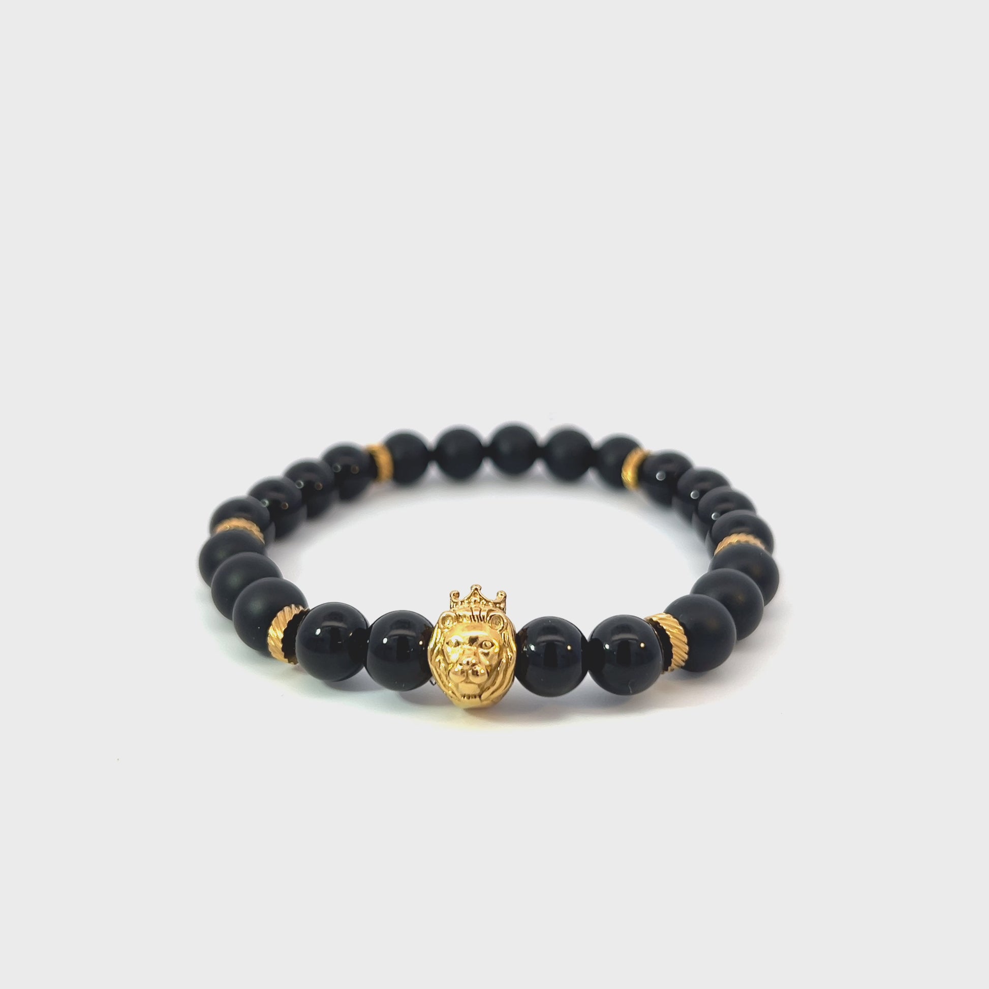 Bead Bracelet - Onyx and Gold Plated Spacers with Gold Plated Lion with a Crown