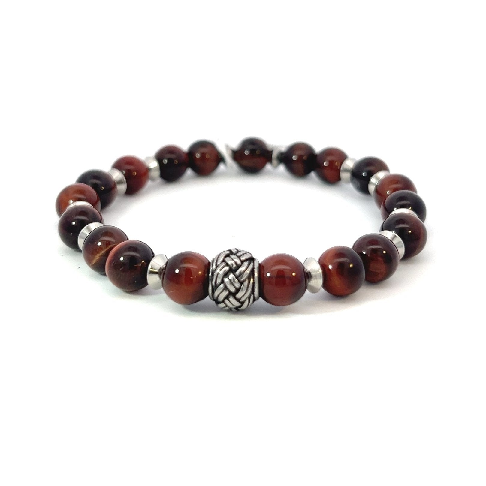 Add a bold statement to your collection with this Stretchy 8mm Red Tiger Eye Bead Bracelet, designed for both comfort and style. Each bead is crafted from genuine Red Tiger Eye, displaying rich shades of red and brown with a natural chatoyancy that catches the light. The centerpiece—a finely detailed metal weave bead—adds a unique, textured contrast, while polished steel spacers provide a sleek, modern finish.