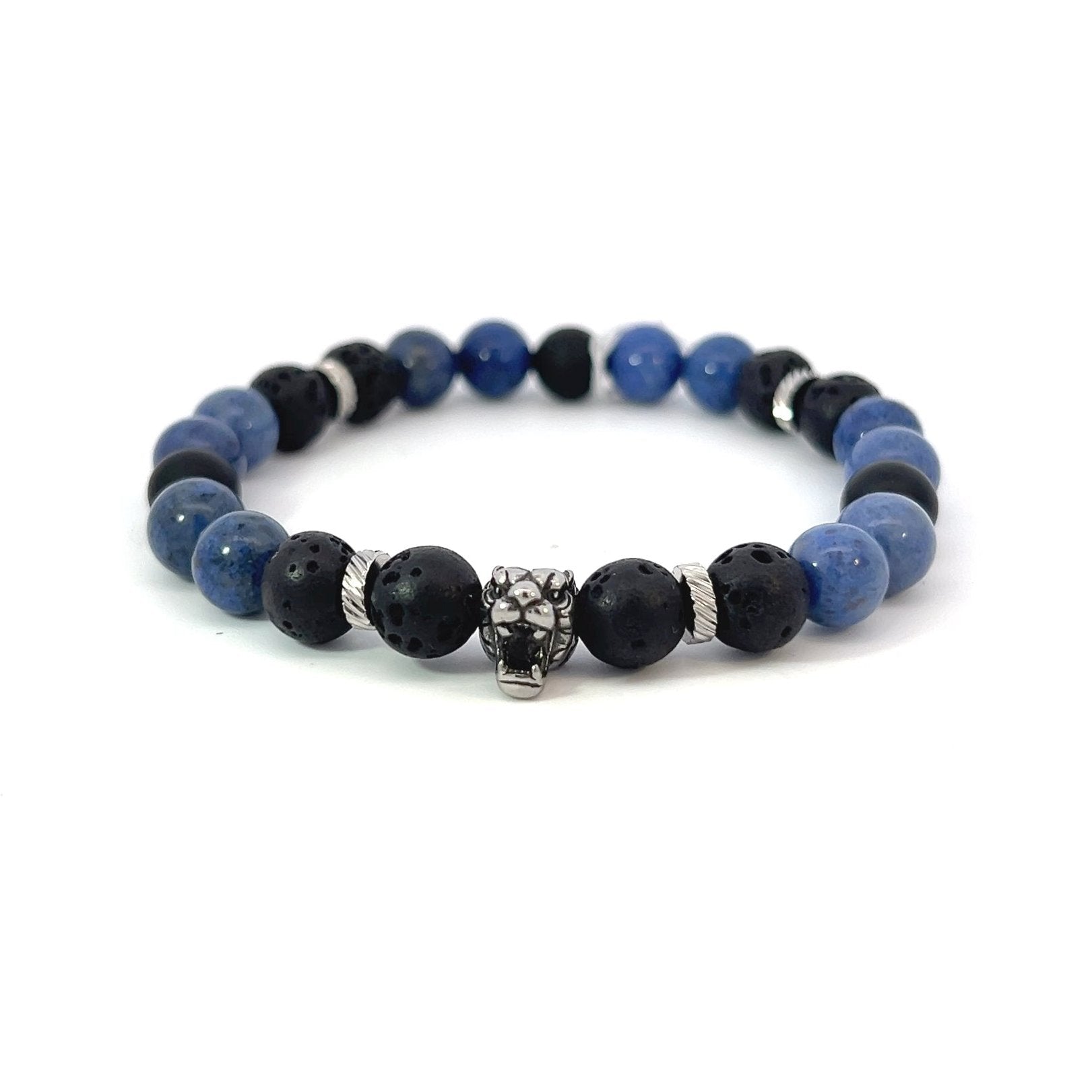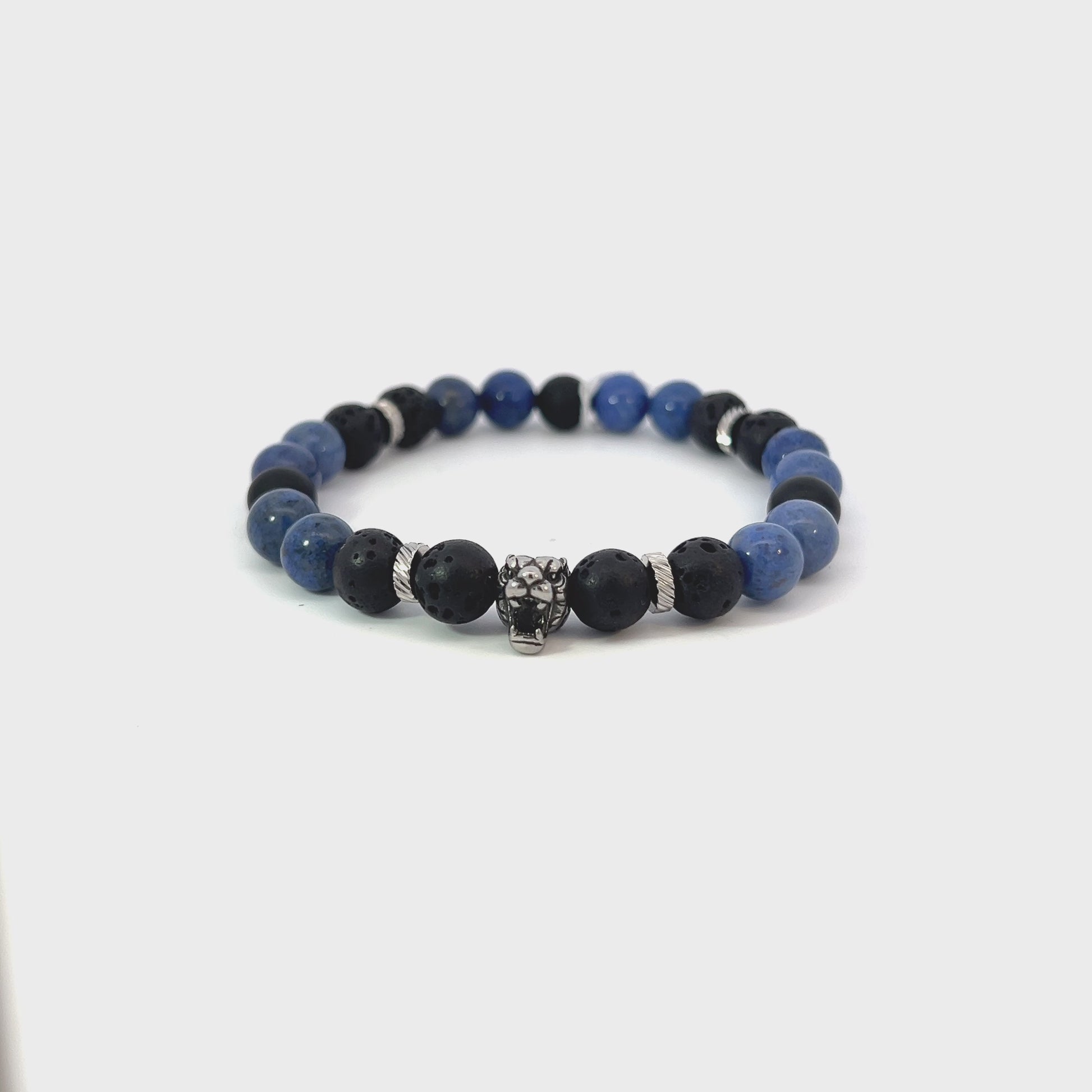 Discover strength and sophistication with this Bead Bracelet crafted from 8mm Sodalite and Matte Onyx beads, accented with sleek silver spacers. The calming blue Sodalite beads encourage mental clarity, while the deep black Lava and Matte Onyx beads provide grounding and protection. Silver spacers add a refined touch, and the silver Tiger centerpiece symbolizes power, courage, and leadership.