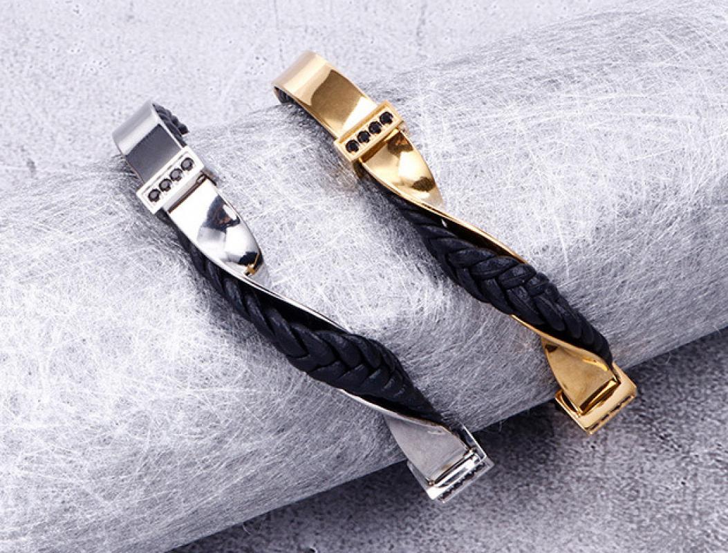 - A stunning fusion of sleek leather and polished gold-plated stainless steel, this twist cuff bracelet is designed for the modern man who values both luxury and style.