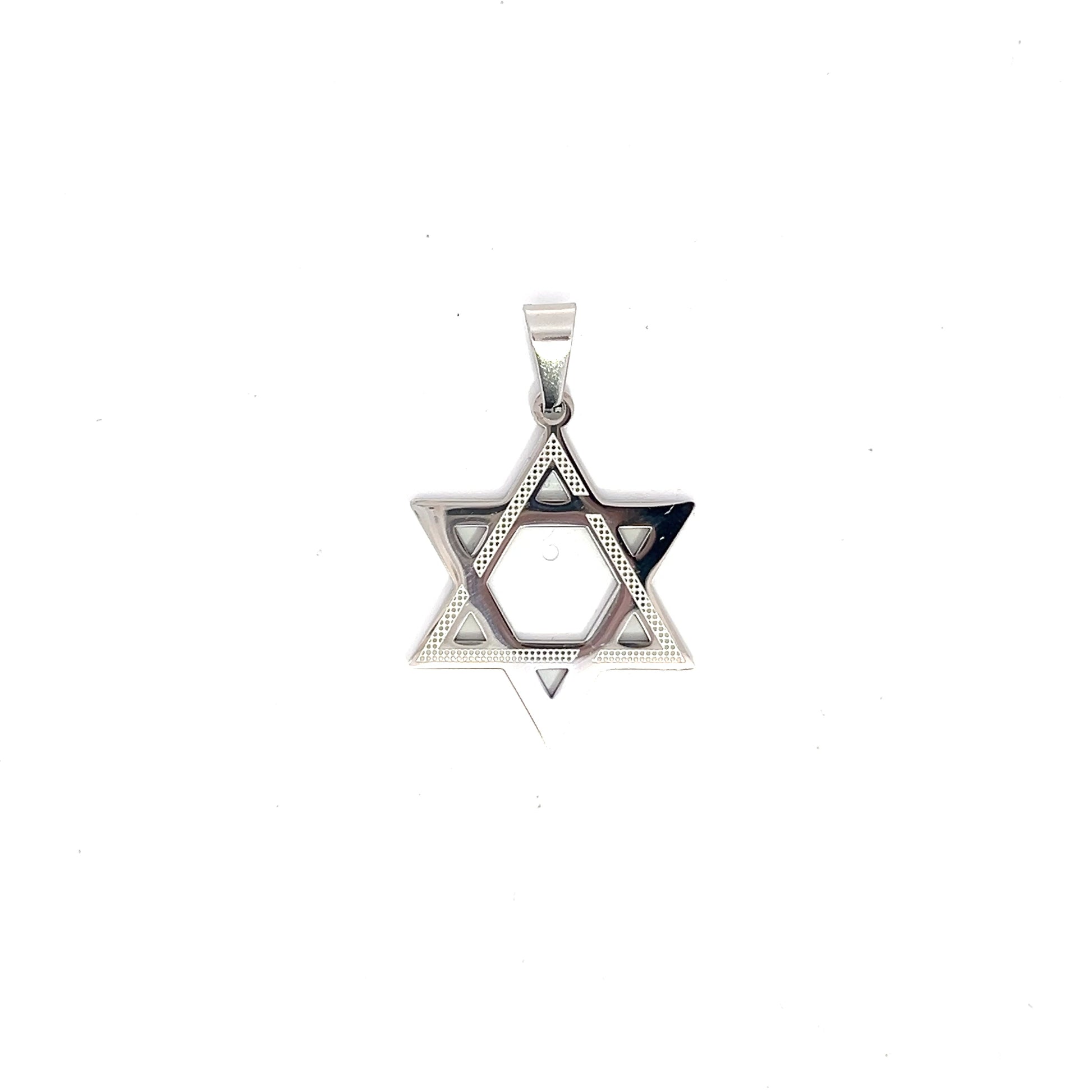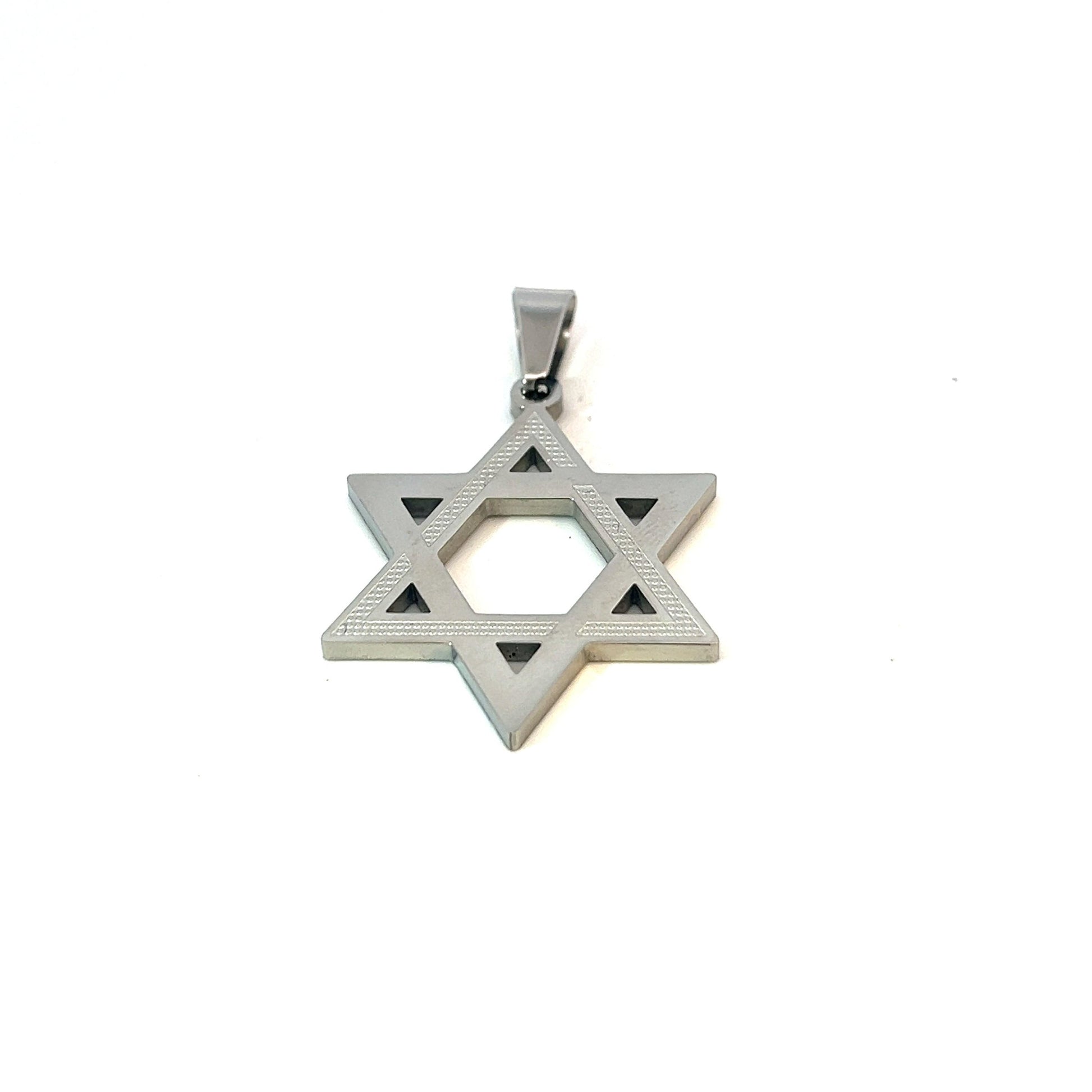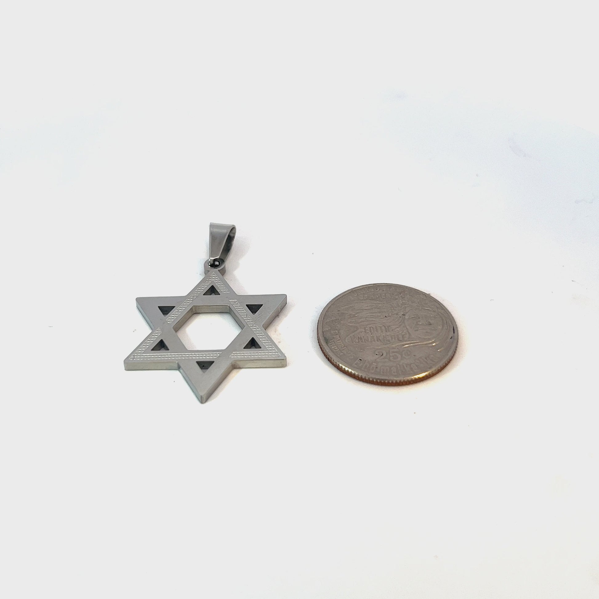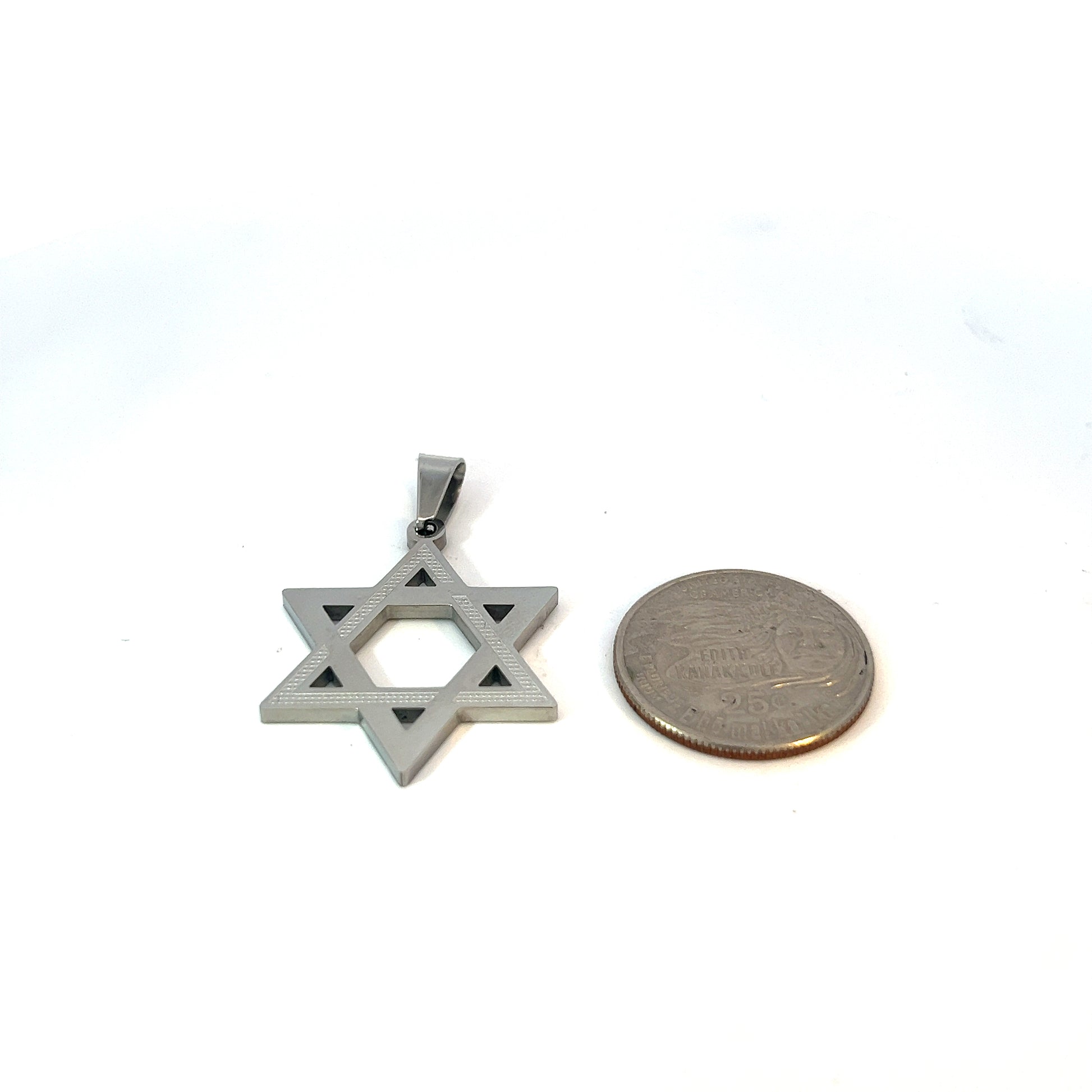 - Design: This pendant features a sleek Star of David with precision-cut details, accented by subtle triangular cutouts within the star