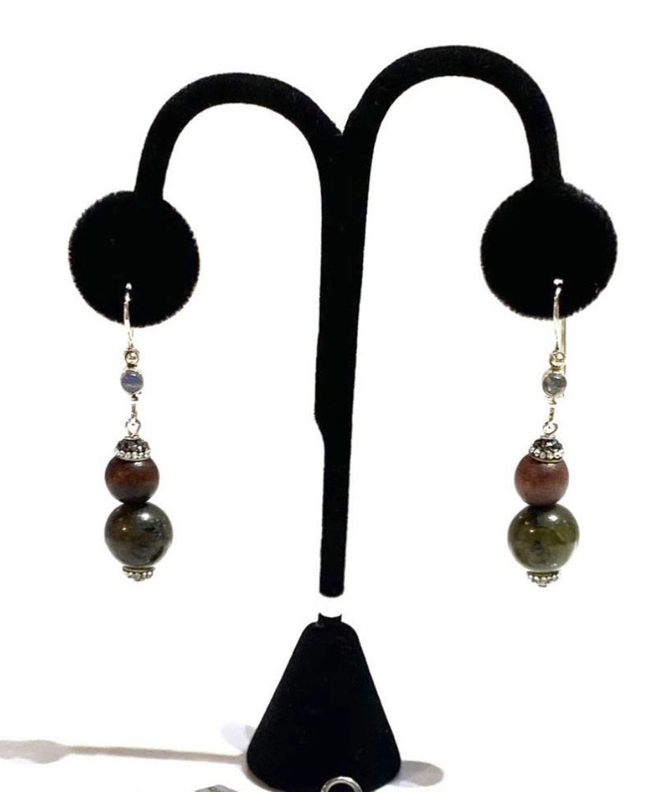 - Drop earrings with dangling Labradorite and wood beads, offering a subtle yet elegant touch to any outfit.