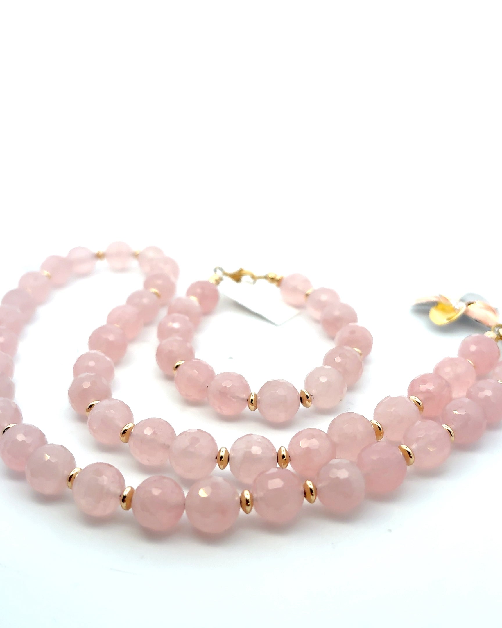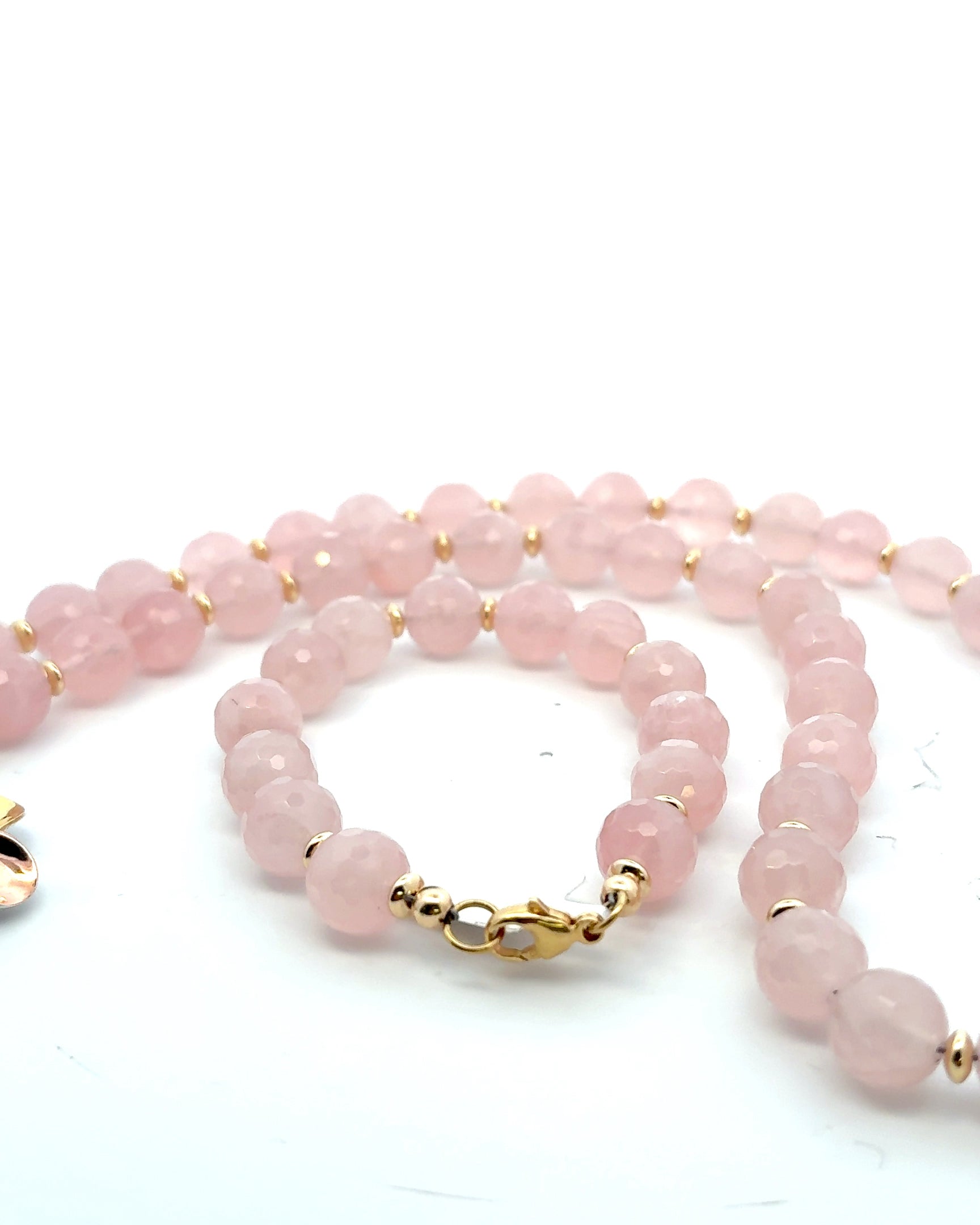 Handcrafted by Bachi Jewels, this elegant jewelry set features the soft, luminous beauty of natural Rose Quartz, accented with refined Gold Filled spacers and finished with a 925 Sterling Silver clasp with gold plating. A timeless, handcrafted design that radiates femininity, warmth, and classic sophistication.