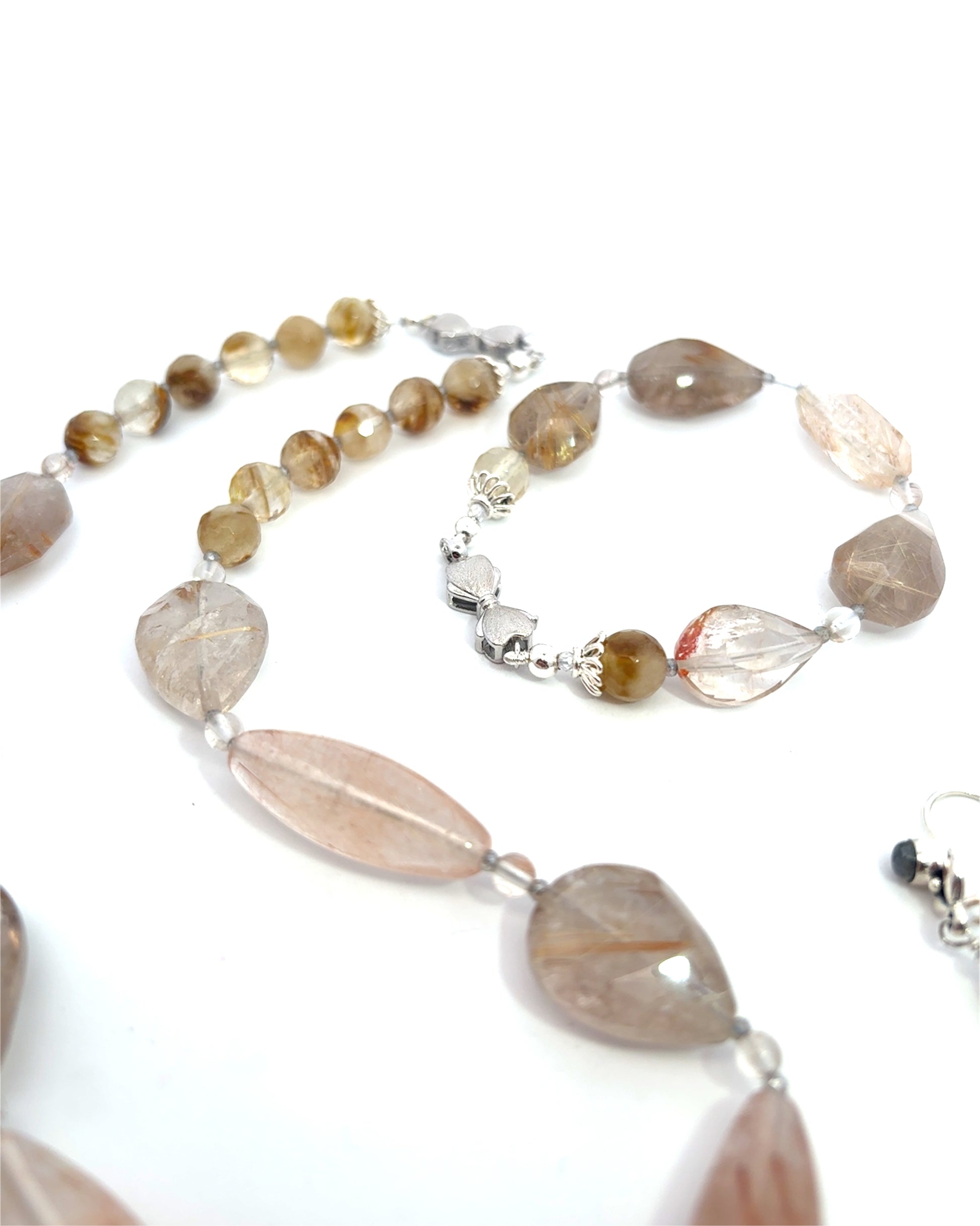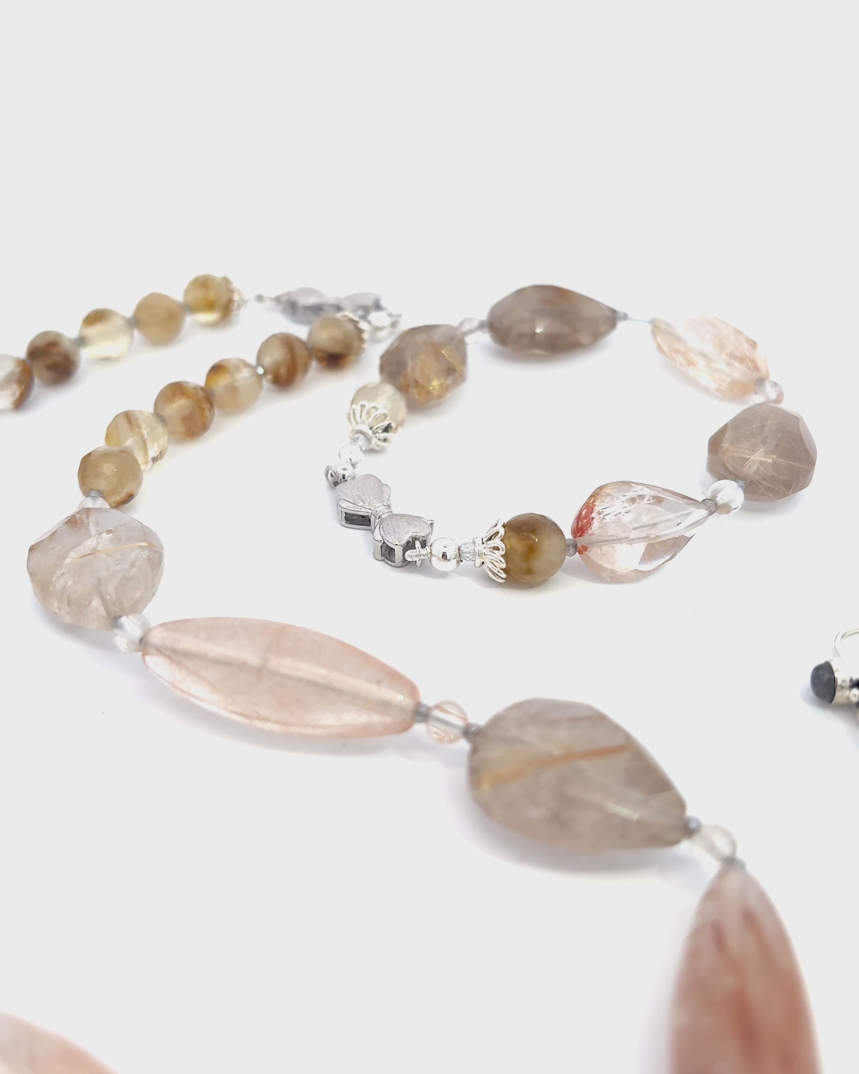 This refined semi-precious stone jewelry set highlights the natural beauty of Rutilated Quartz and Labradorite, combining unique textures and subtle shimmer to create a sophisticated and contemporary aesthetic. Both stones bring character, depth, and a timeless visual appeal, enhanced by a silver clasp that adds durability and a classic finish.